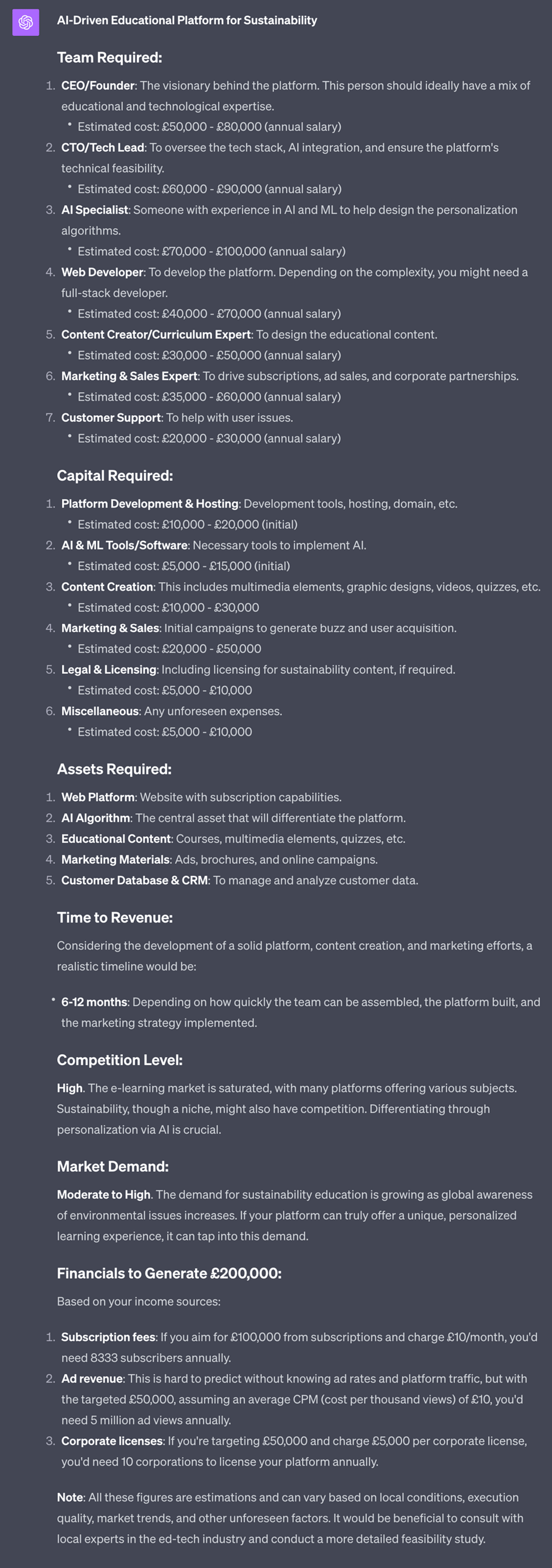 ChatGPT will generate a complete business breakdown of what you’ll need to get in place to make this business work.